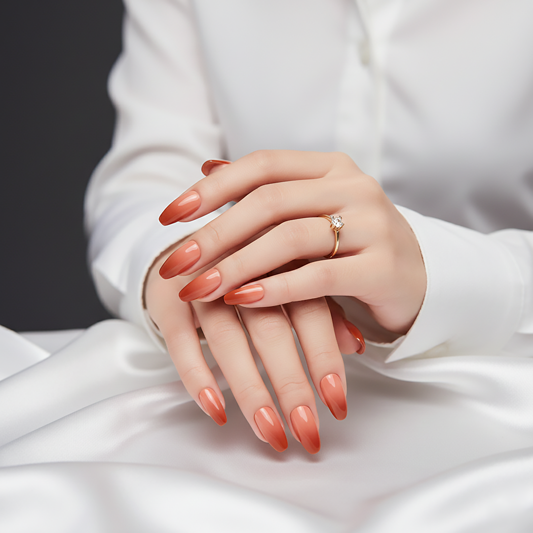 A refined amber ombre finish in an elegant almond shape, designed to deliver a natural yet polished look. Lightweight, durable, and easy to apply for a smooth, salon-style result suitable for any occasion.