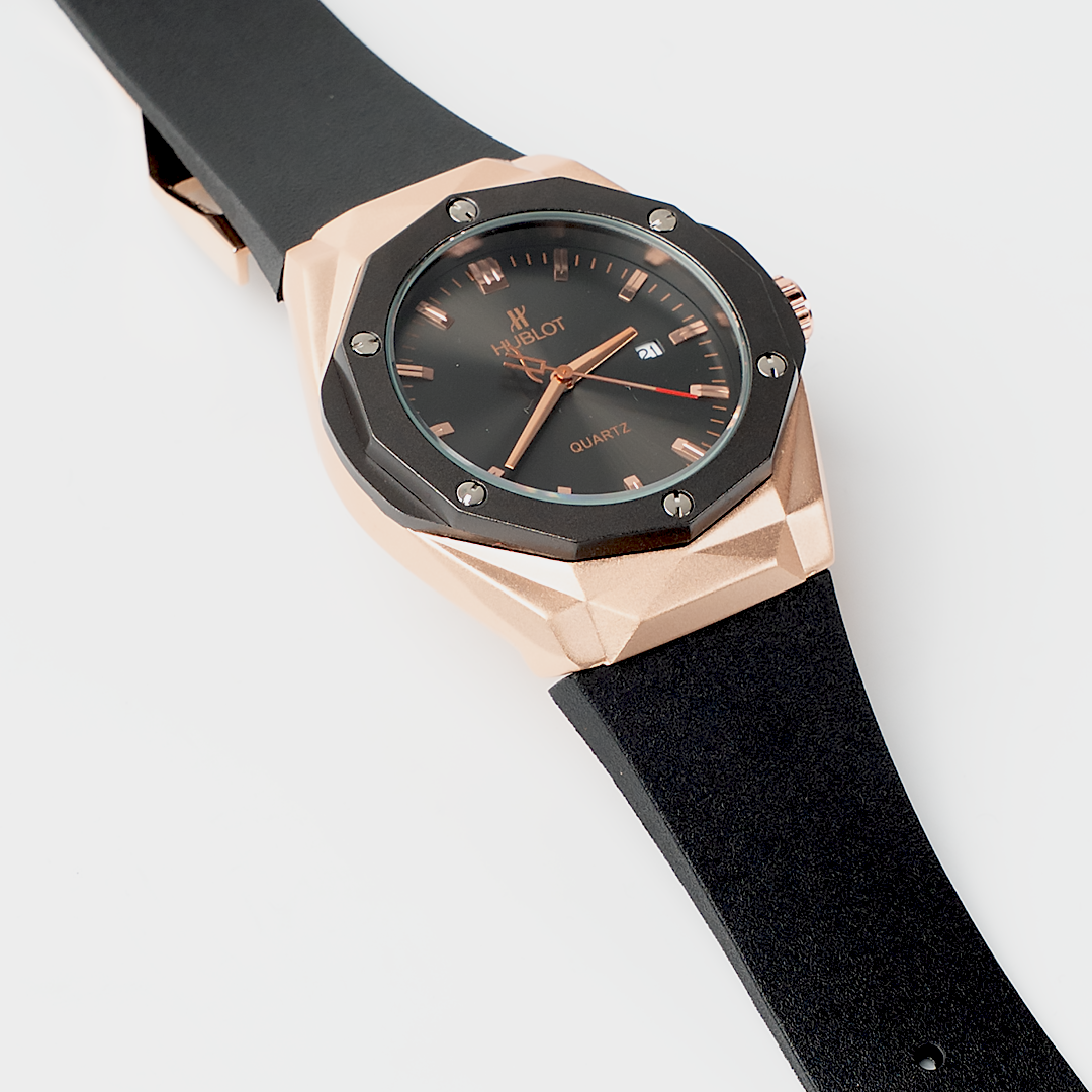 Stylish faceted rose-gold case with a modern geometric design