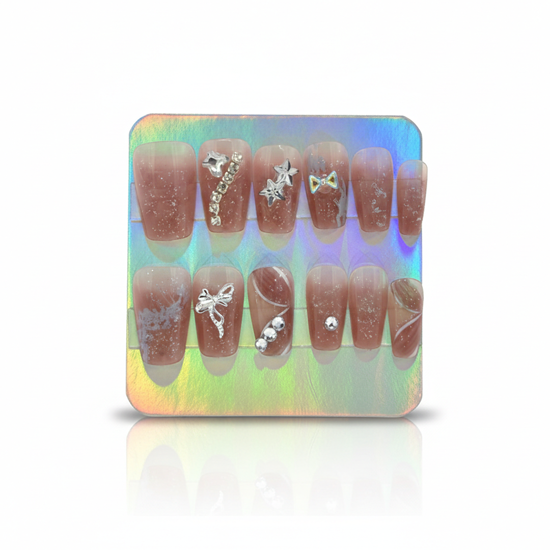 Elegant nude press-on nails featuring subtle shimmer, delicate star and bow accents, and refined crystal details. A polished, modern design perfect for an understated yet sophisticated look.