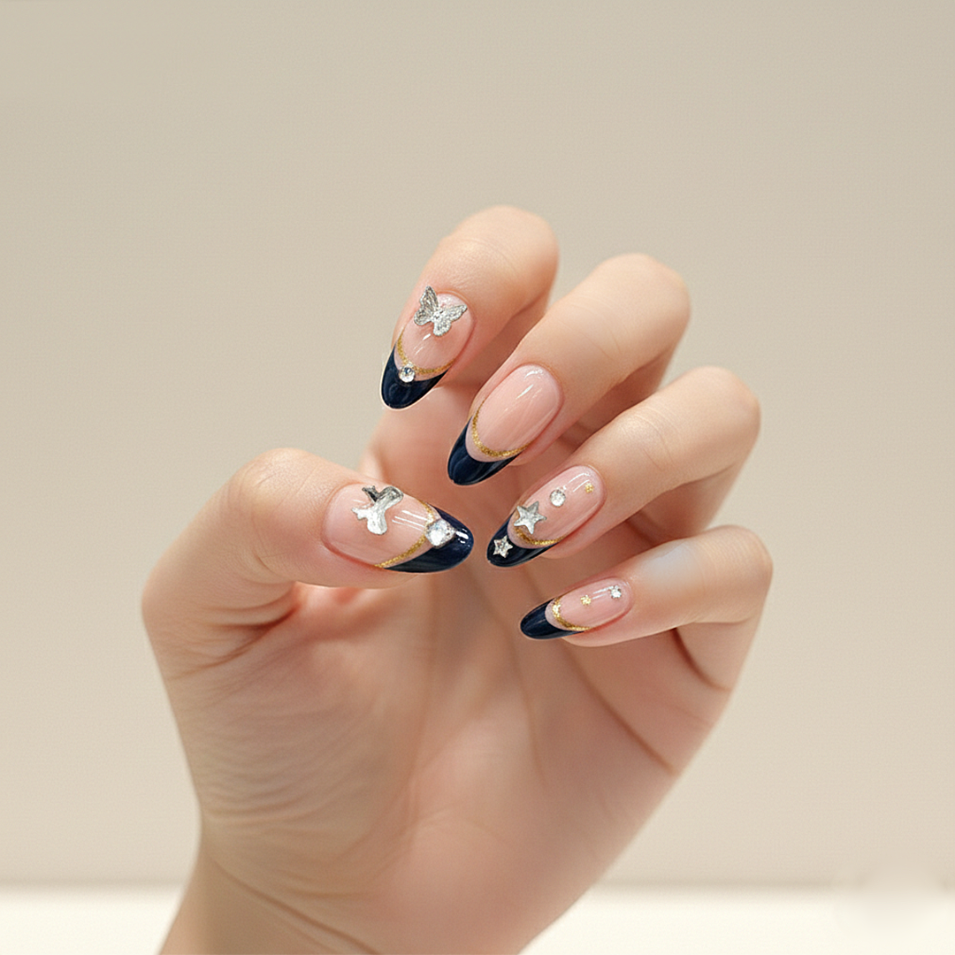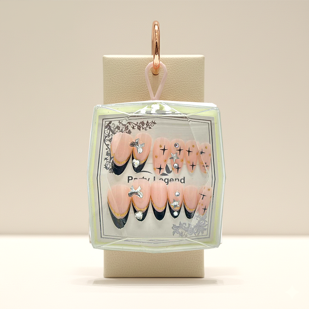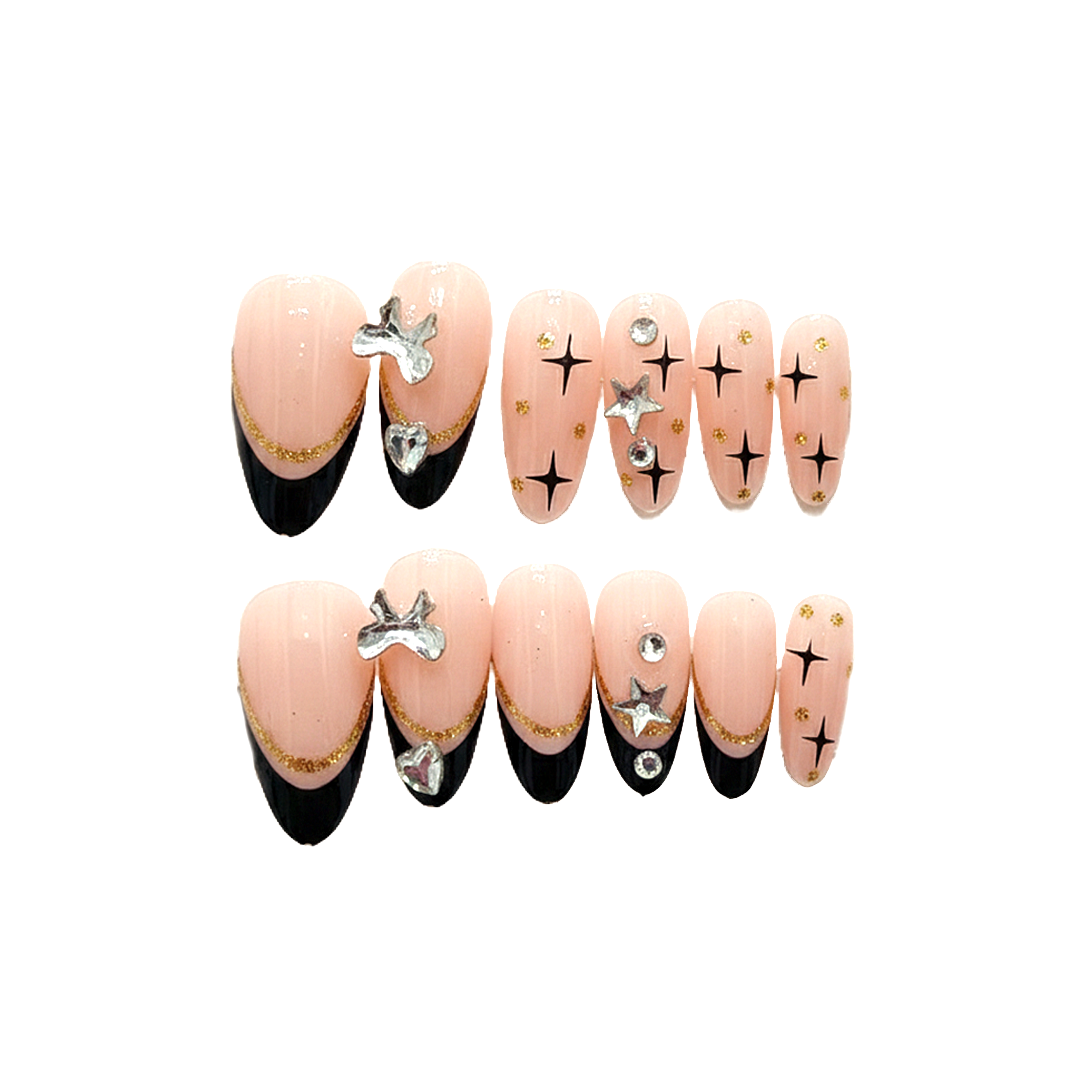 Adorn your fingertips with this enchanting set of press-on nails, featuring a delicate pink base with striking black tips and elegant gold accents. Embellished with dazzling crystal bows, charming heart-shaped gems, and sparkling star motifs, these nails offer a celestial touch of glamour and sophistication.
