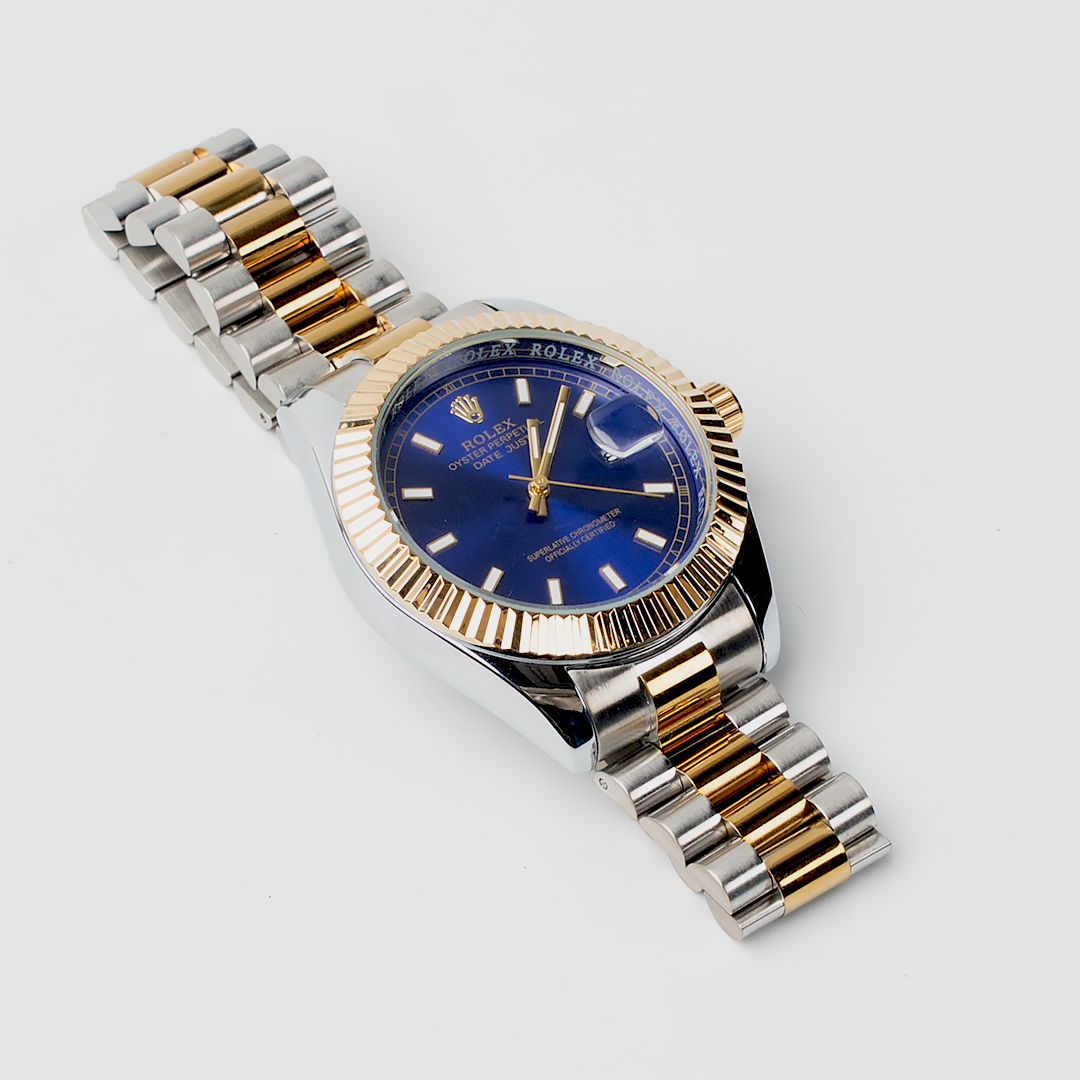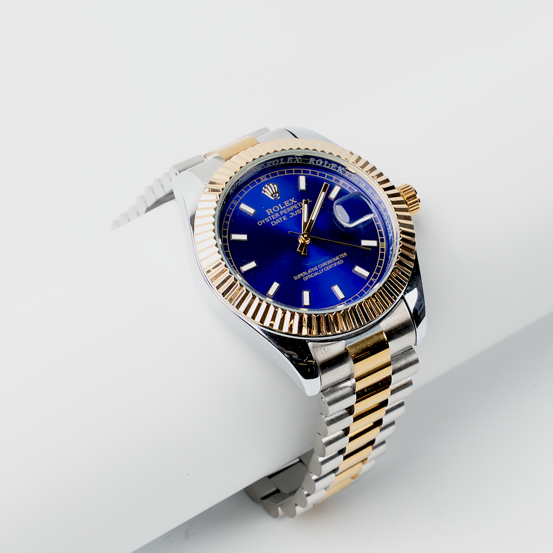 The Celestial Two-Tone Blue Dial Watch presents a sophisticated balance of modern elegance and classic design. Featuring a striking deep blue dial paired with a polished two-tone stainless steel bracelet, this watch adds a refined statement to any look. Crafted for versatility, it seamlessly transitions from formal settings to everyday wear while maintaining a premium, timeless appeal.