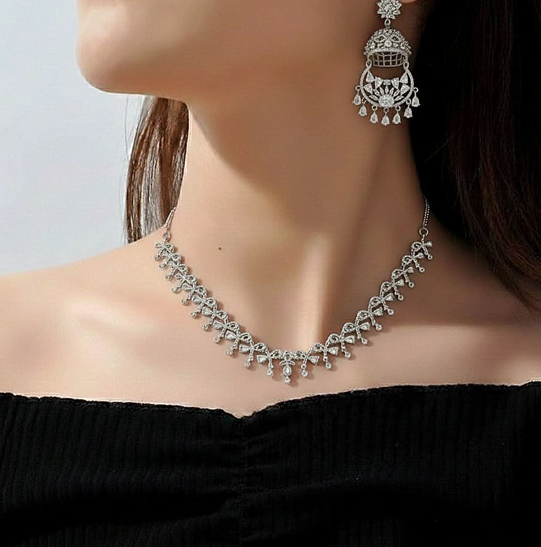 Enhance your elegance with this stunning silver-toned choker set, featuring delicate crystal-studded details and graceful drop accents. Paired with statement jhumka earrings adorned with shimmering stones, this beautifully crafted set is perfect for weddings, festive celebrations, and special occasions.