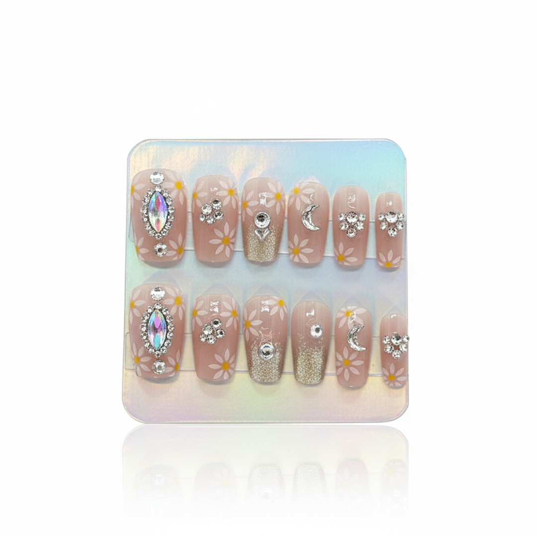 Soft nude press-on nails adorned with delicate daisy accents, subtle shimmer, and elegant crystal details. A refined design that blends femininity and sparkle for a graceful, salon-inspired finish.