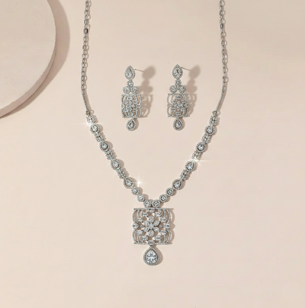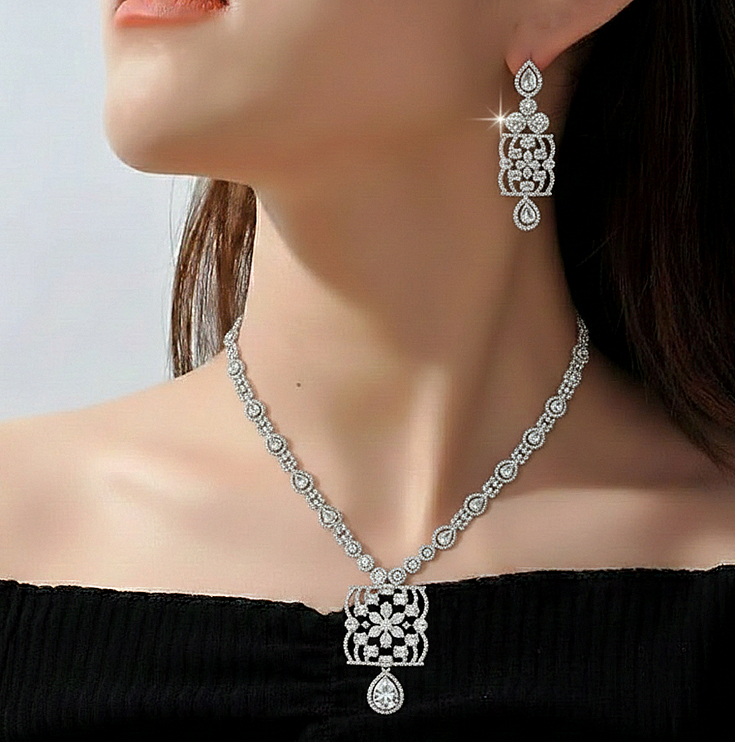 The coordinating chandelier earrings mirror the elaborate filigree design and feature matching teardrop crystal drops, creating a perfectly harmonized and breathtaking ensemble. Ideal for grand occasions, formal events, or as a luxurious gift.