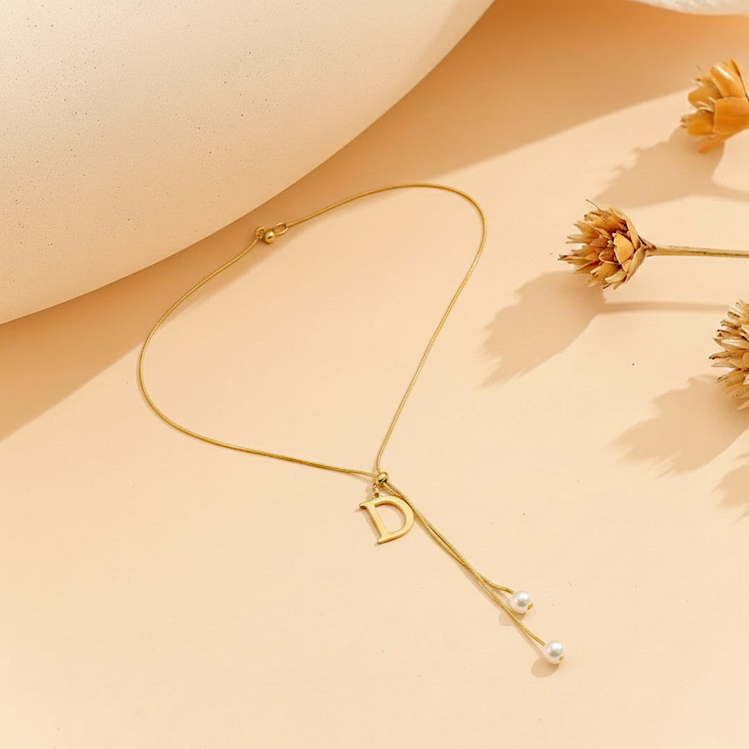 Elevate your style with our elegant Gold Initial 'D' Pendant Necklace. This beautiful piece features a delicate gold-tone chain showcasing a polished 'D' initial charm. Two gracefully dangling pearl tassels add a touch of sophistication and movement, making this necklace a unique statement piece. Perfect for personalized gifting or adding a refined touch to your everyday and special occasion outfits.