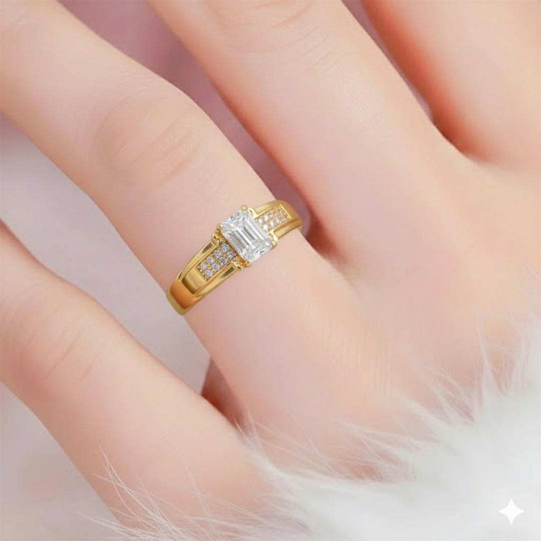 This modern design features a brilliant rectangular cubic zirconia center stone, set prominently in a lustrous gold-toned band. The sides of the band are subtly accented with rows of smaller, sparkling cubic zirconias, adding a touch of glamour. Perfect for those who appreciate understated elegance with a bold geometric flair.
