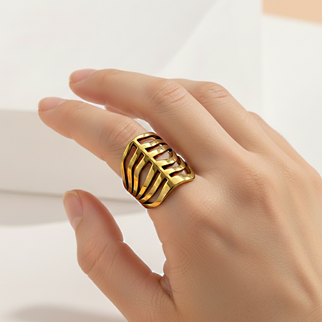 Elevate your style with this striking Golden Multi-Band Statement Ring. Crafted with a modern open-work design featuring graceful parallel bands, this ring adds a touch of contemporary elegance to any ensemble. Perfect for making a bold fashion statement.