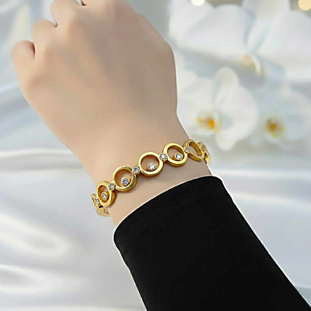 Designed with interlinked circular motifs and subtle crystal accents, this piece offers a refined balance of modern elegance and timeless appeal. Its polished finish and graceful form make it a versatile accessory for both everyday wear and special occasions.