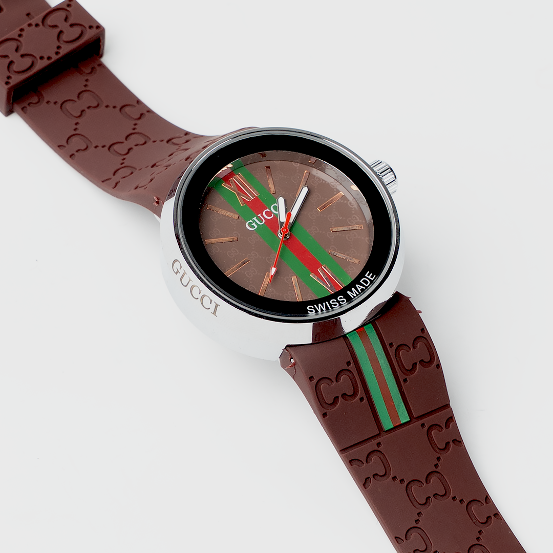 This Gucci Classic Brown Dial Stripe Watch blends modern fashion with a signature luxury touch. Featuring the iconic green-red stripe across a textured brown dial and paired with a matching embossed silicone strap, it delivers a stylish yet comfortable everyday wear experience. Designed for individuals who appreciate bold branding with refined simplicity.