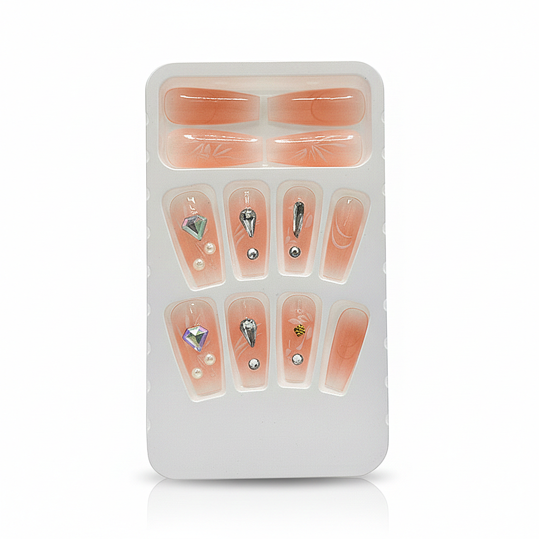 Adorn your fingertips with this enchanting press-on nail set, featuring a captivating peach ombre gradient. Each nail is meticulously embellished with sparkling faceted gems, lustrous pearls, and subtle floral accents, creating a look of refined elegance and charm.
