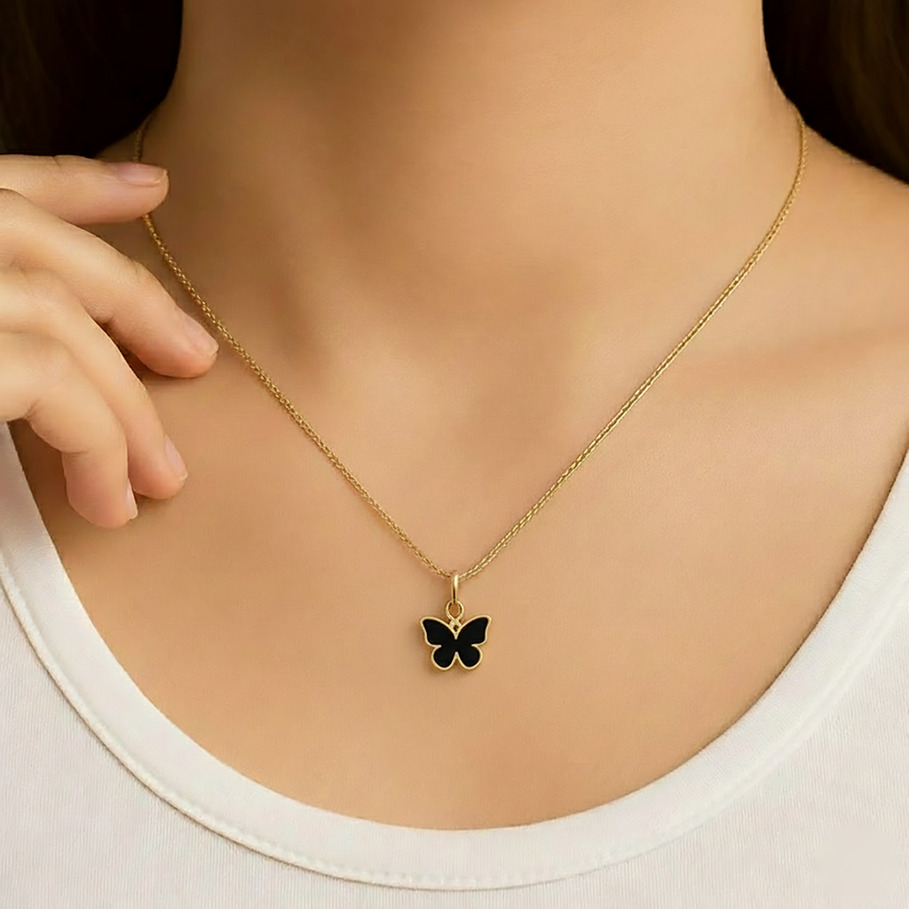 A refined butterfly-shaped pendant featuring a sleek dark inlay framed in a polished gold-tone finish. Designed to express elegance and transformation, it offers a modern yet timeless accent for everyday wear or graceful layering.