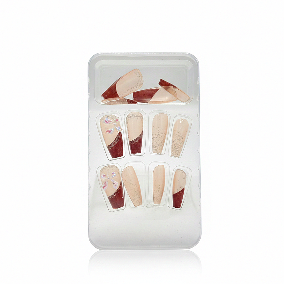 A luxurious press-on nail set featuring a warm nude base with rich mocha tones, soft shimmer accents, and elegant crystal bow details. Designed to deliver a refined and graceful look, perfect for both everyday wear and special occasions.