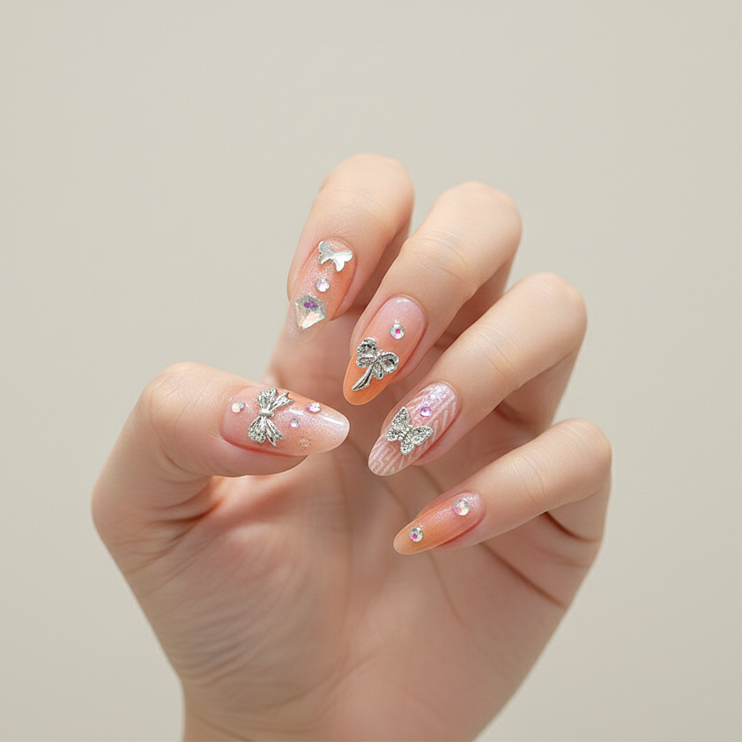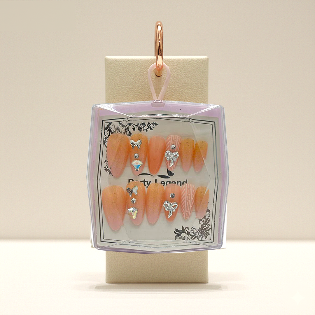 Infuse your style with warmth and sparkle using this delightful press-on nail set. Featuring a shimmery peachy-orange base, these nails are adorned with elegant crystal bows, a striking iridescent gem, and a cozy knitted texture design, offering a charming and unique manicure.