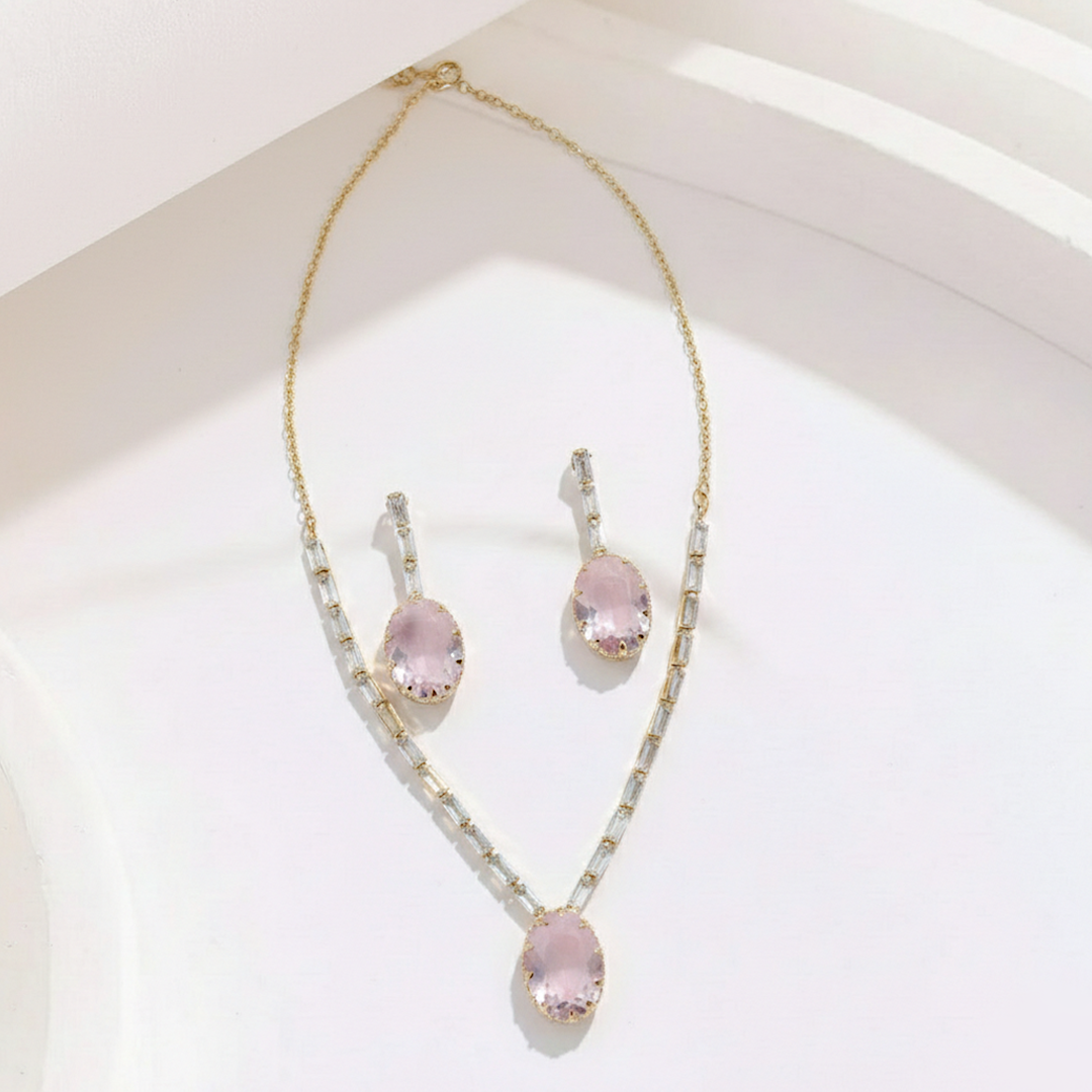 Elegant gold-tone jewelry set, featuring a captivating necklace with a central pink oval gemstone, beautifully complemented by sparkling baguette-cut clear crystals. Matching drop earrings echo the sophisticated design, making this set perfect for adding a touch of refined glamour to any outfit.