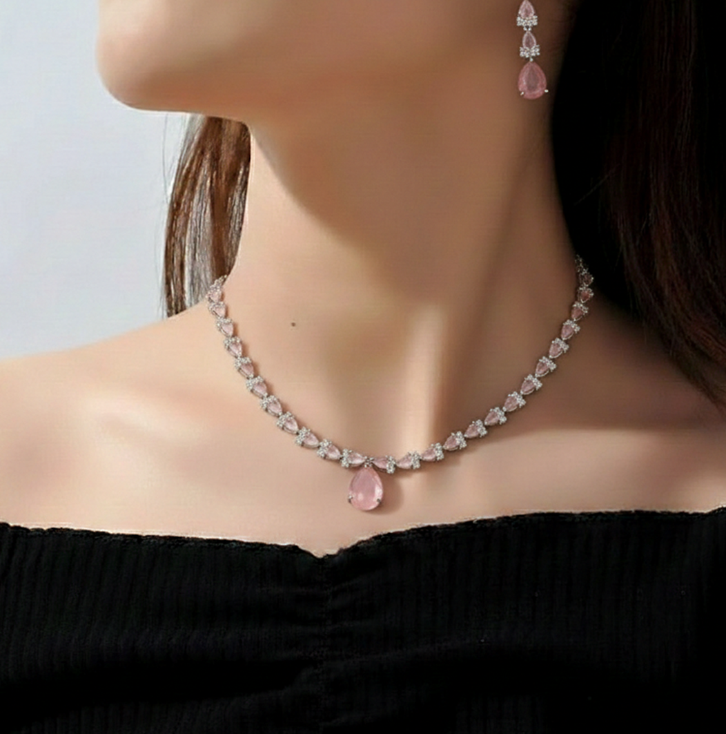 This elegant and feminine ensemble is perfect for brightening any occasion, offering a sophisticated pop of color. The coordinating earrings complete the graceful look of the necklace.