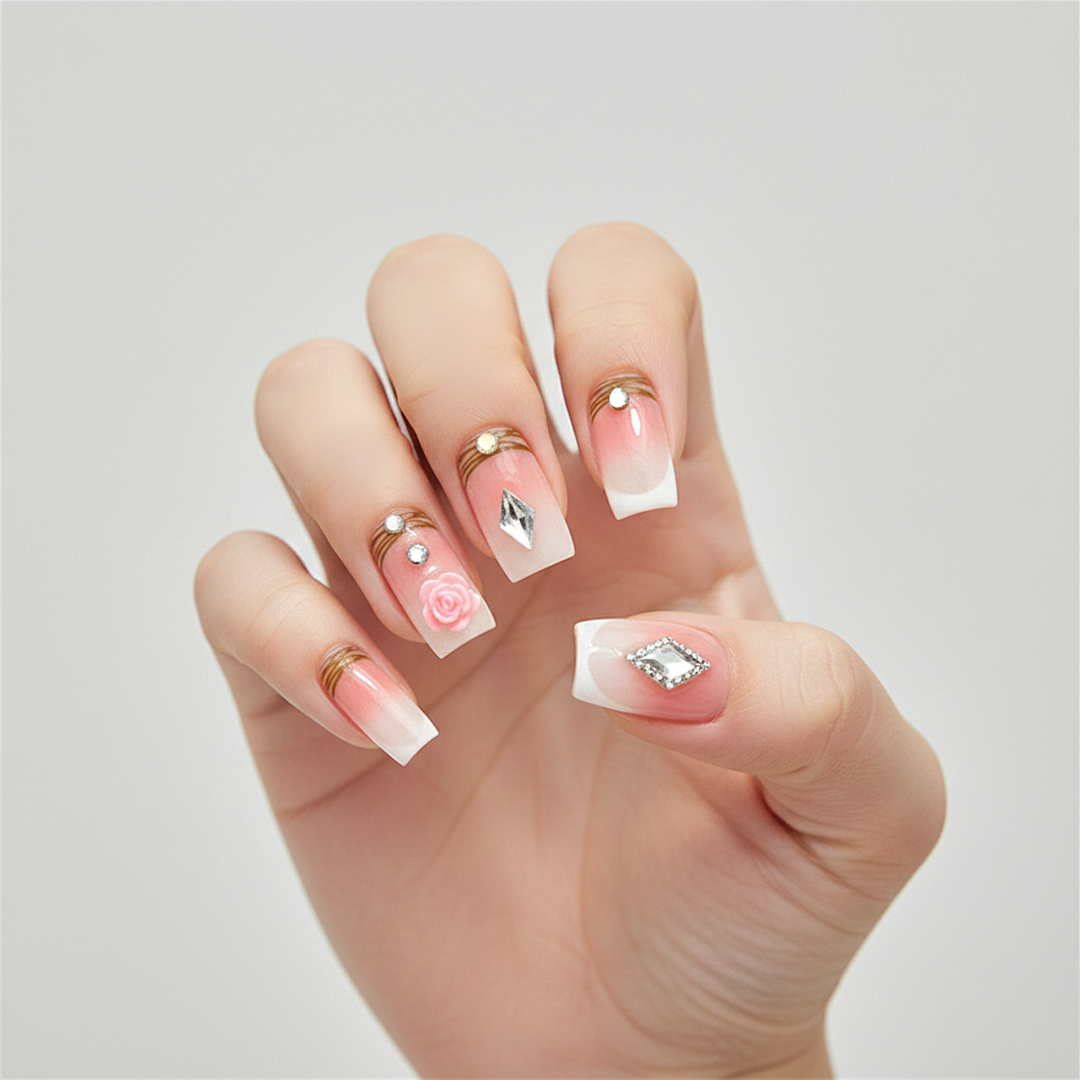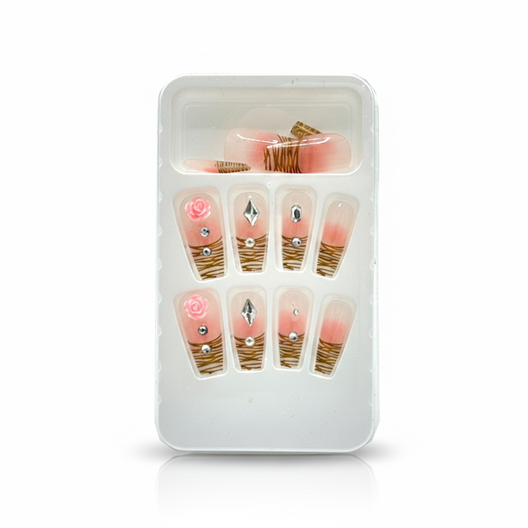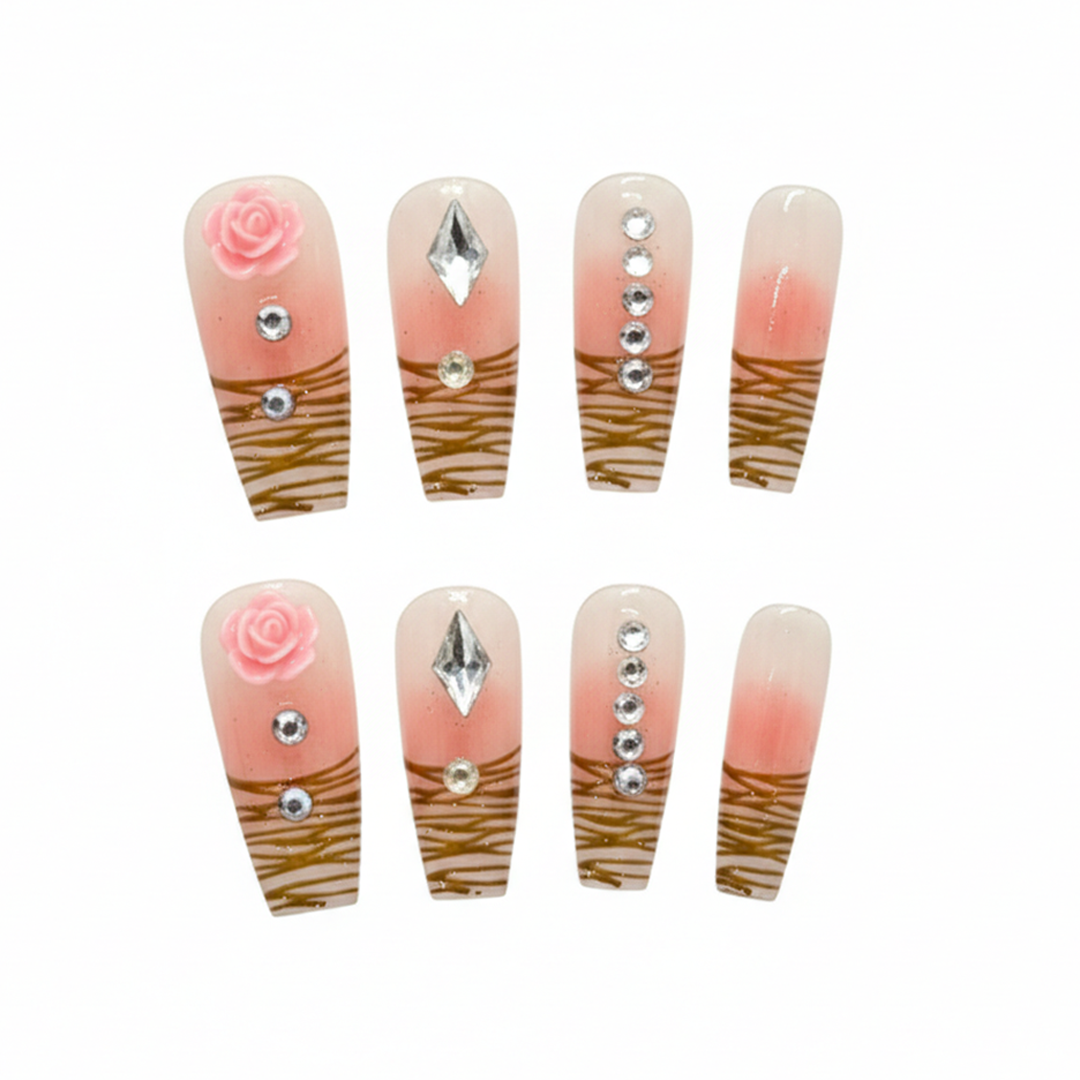 Adorn your nails with this enchanting press-on set, featuring a delicate pink ombre transitioning into a chic woodgrain pattern. Each nail is beautifully accented with sparkling gems and charming 3D pink roses, offering a unique blend of natural elegance and whimsical flair.