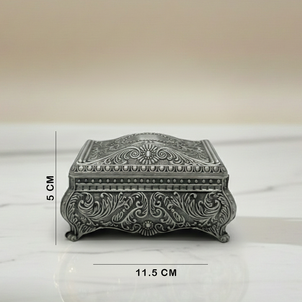 An exquisitely detailed metal storage piece with intricate scrollwork and a vintage finish, perfect for keeping jewelry and small valuables organized while enhancing the elegance of a dressing table.