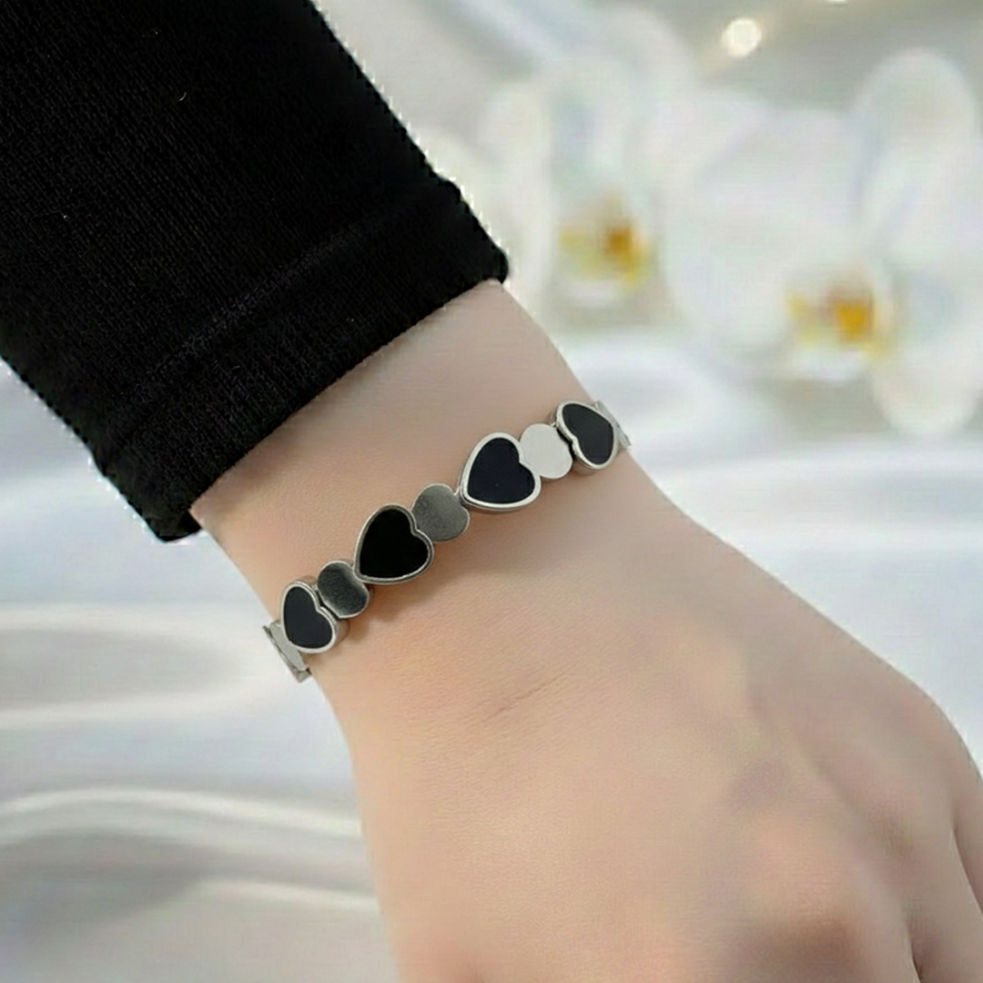 Showcase your style with the Elegant Silver Heart-Inlay Bangle Bracelet, featuring polished silver with chic black heart accents and a comfortable hinged design for a secure, modern look.