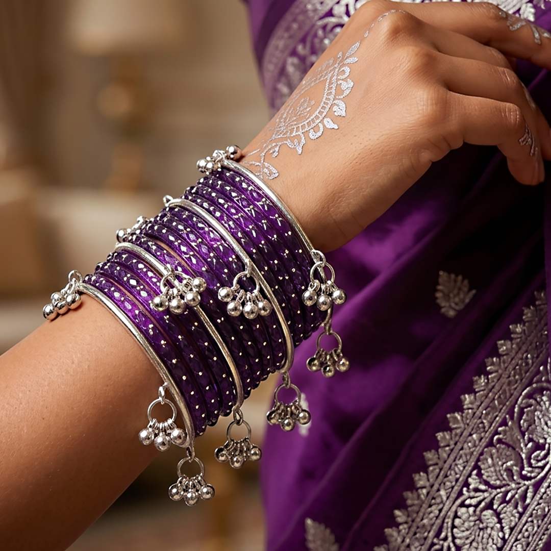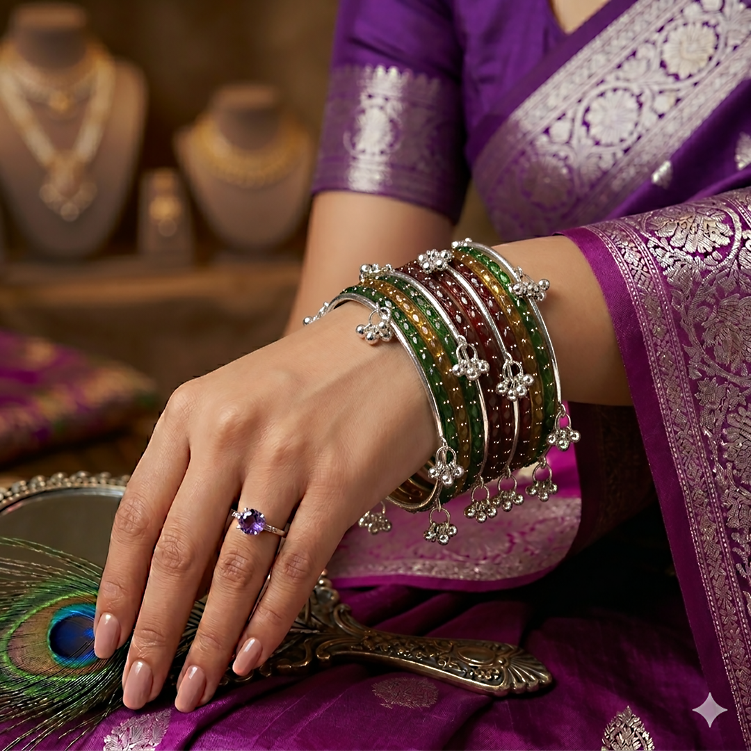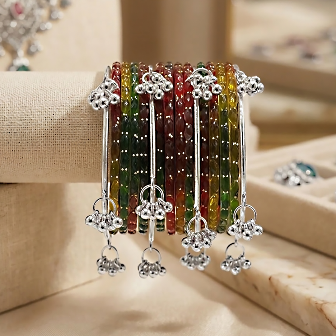 Elevate your traditional style with the Silver Kashmiri RD Bangles Set, a perfect blend of elegance and timeless craftsmanship. Each bangle is meticulously designed with intricate Kashmiri motifs, showcasing delicate artistry that reflects rich heritage. The radiant golden finish adds a touch of luxury, making this set ideal for weddings, festive occasions, or special celebrations. Lightweight yet durable, these bangles offer comfort without compromising on style. Complete your ethnic ensemble with this stunning set that embodies grace, tradition, and sophistication.