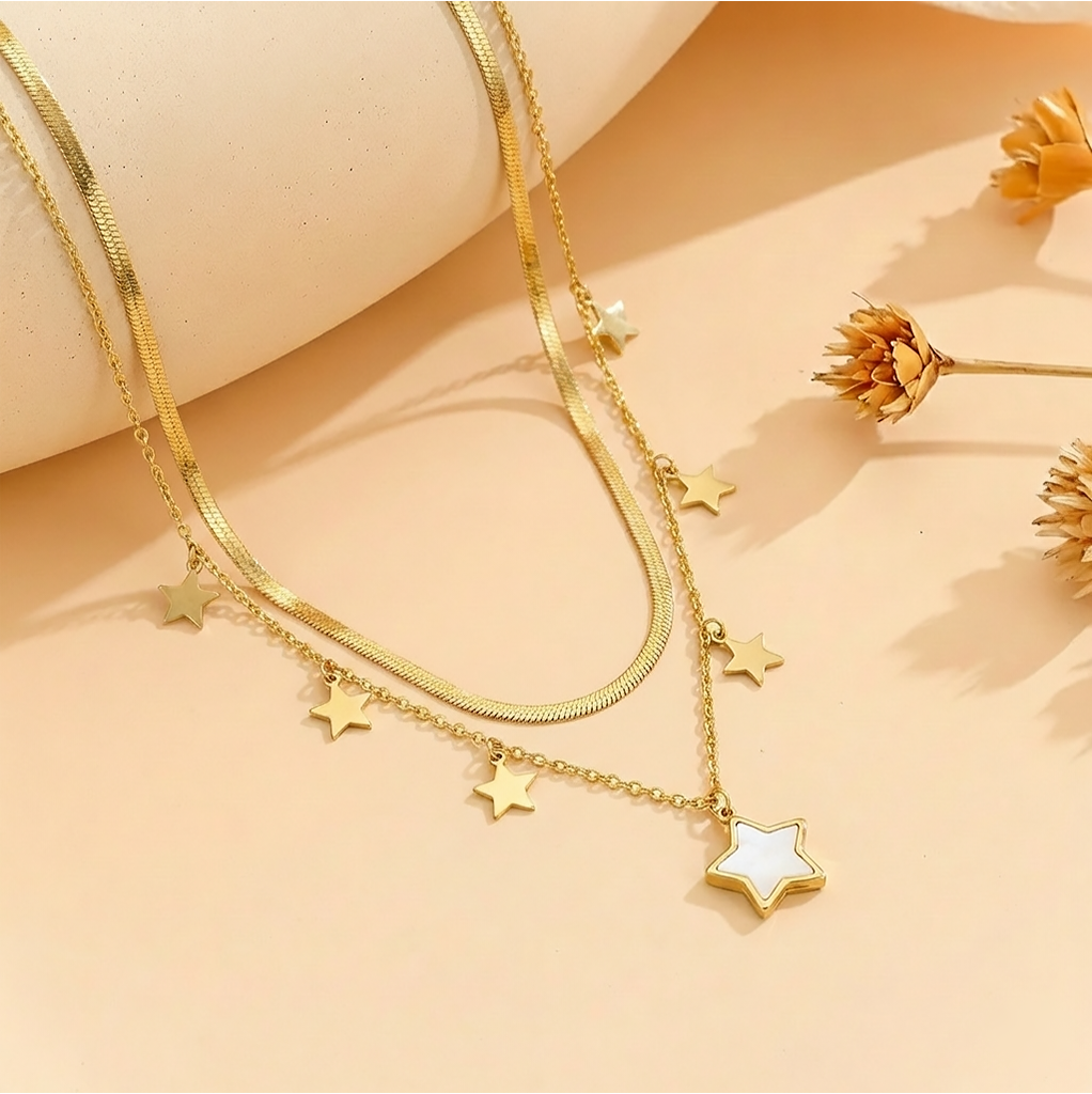 A refined layered necklace featuring delicate star charms with a sleek gold-tone finish. Designed to add subtle elegance and a modern celestial touch to both everyday and evening looks. Lightweight, stylish, and effortlessly versatile.