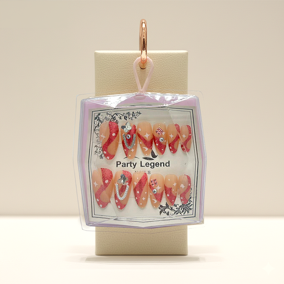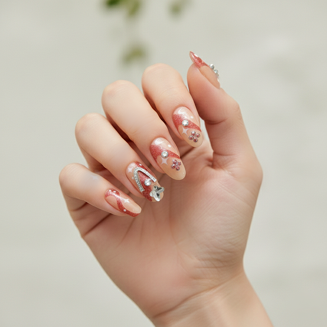 These elegant press-on nails feature a sparkling red glitter wave design over a natural base, accented with delicate white stars and moons. Adorned with shimmering rhinestone embellishments, including graceful butterflies and intricate clusters, they offer a sophisticated and enchanting look.