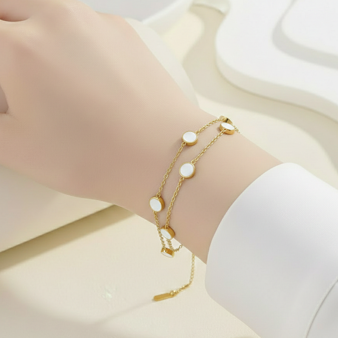 Modern gold-tone layered bracelet featuring dual chains accented with sleek white disc charms. A refined statement piece designed to elevate both everyday and dressy looks.